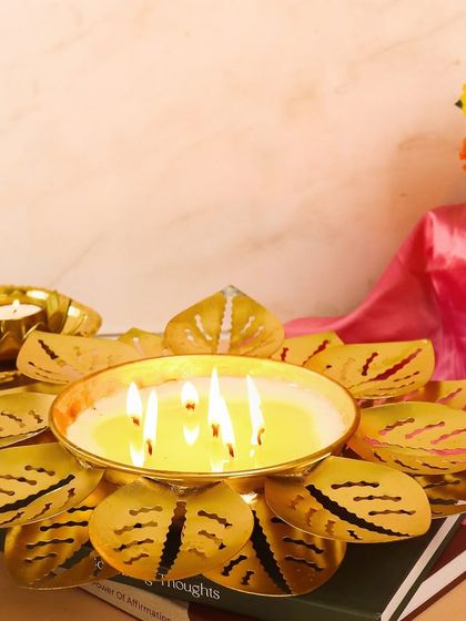 For Diwali and other big days, I go all out - Lotus Urli Candle Bowls (big gold, multi-wick, scented) and pastel Lotus Jars. They’re flashy and make for epic centerpieces.