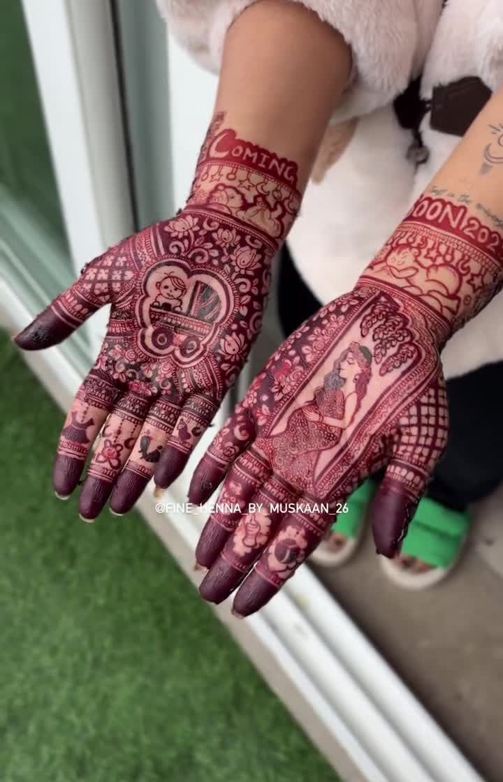 Celebrating the journey to motherhood with special henna art. I design cute and personalized mehndi for baby showers, featuring motifs like baby feet, cradles, 'Mom to be' text, and portraits of the expecting parents.
