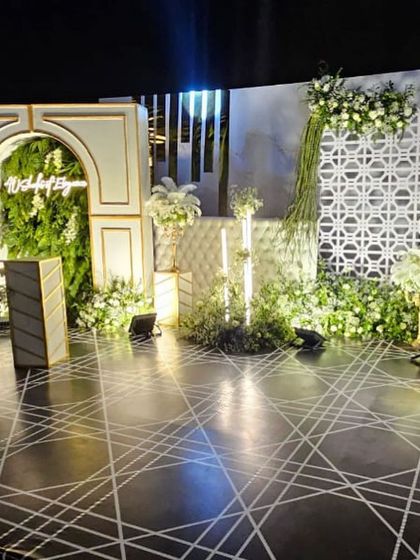 - Walkway: 20ft path with floral/lit arches, carpet, and welcome signage.