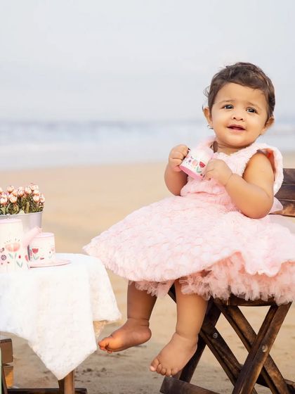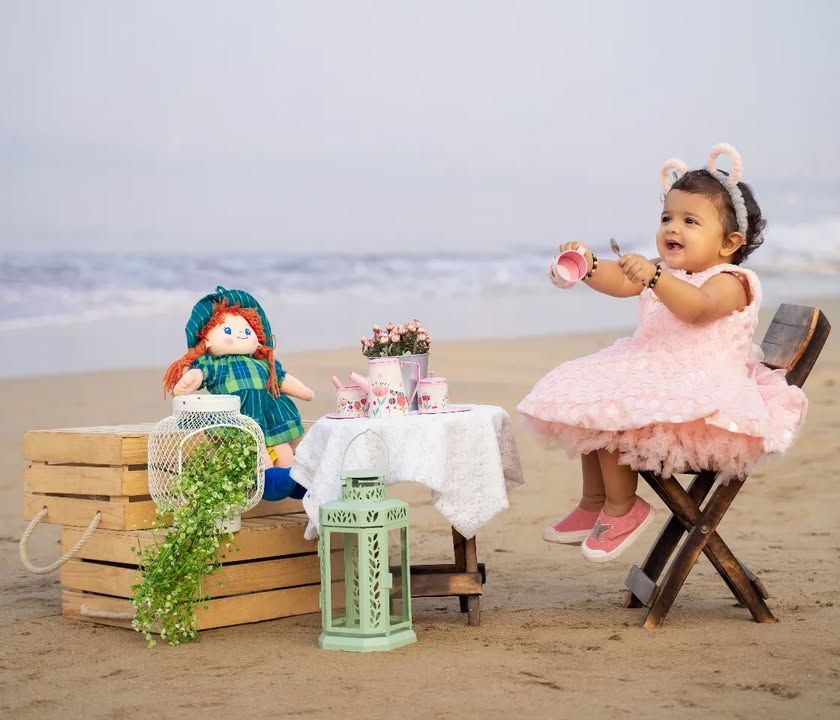 Let's take the fun outside. We offer outdoor sessions, like this charming tea party on the beach, to capture your child in a beautiful, natural setting with soft, golden light.