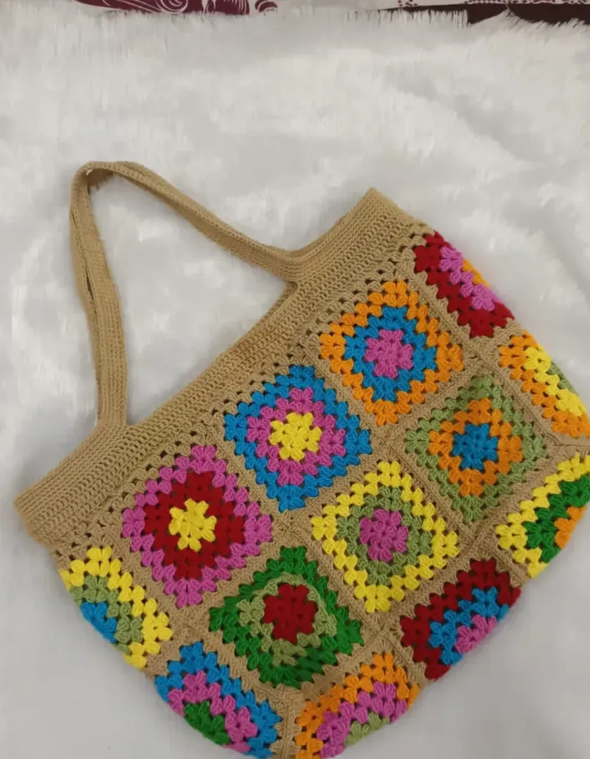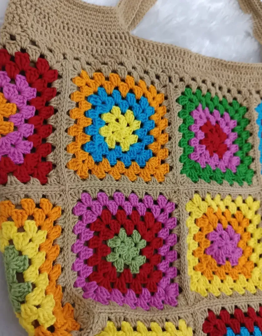 I make these tote bags with strong cotton yarn, perfect for your daily needs. You can choose your favorite style, like the classic Granny Square or the wavy Gelato, and I'll add a soft lining and sturdy handles to make it just right for you.