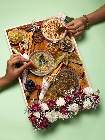 - Gourmet Dips: 3 house-made varieties (Signature Beetroot Yogurt, Roasted Pepper Hummus, Herbed Cream Cheese).
