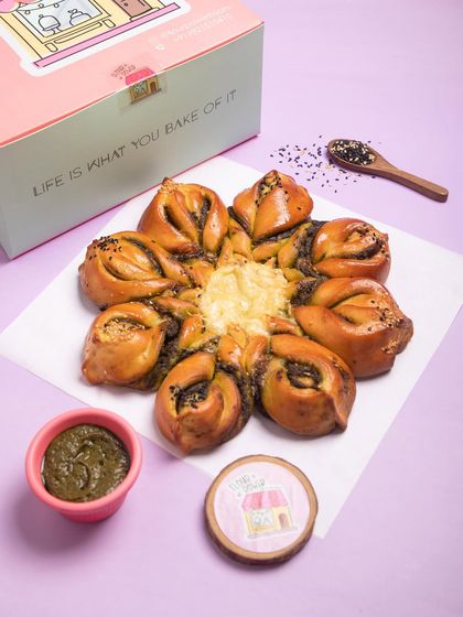 My bakery offers more than just sweets. I bake a wide range of artisanal breads, including stunning pull-apart snowflakes, New York style bagels, and soft Mediterranean pitas. I also create unique savoury snacks like baked vada pav puffs and a variety of creamy, handmade dips.
