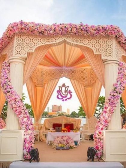 - Traditional four-pillar mandaps, heavy florals, banana leaves for South Indian style, or modern open pastel mandaps for day weddings.