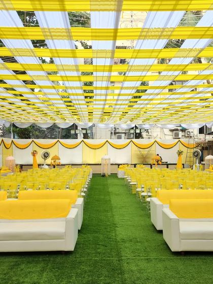 I love bringing energy and color to Haldi and Mehendi ceremonies. This gallery shows a variety of setups, from traditional yellow marigold themes to vibrant multi-color mela concepts and unique Moroccan-inspired designs with blue and yellow tiles.