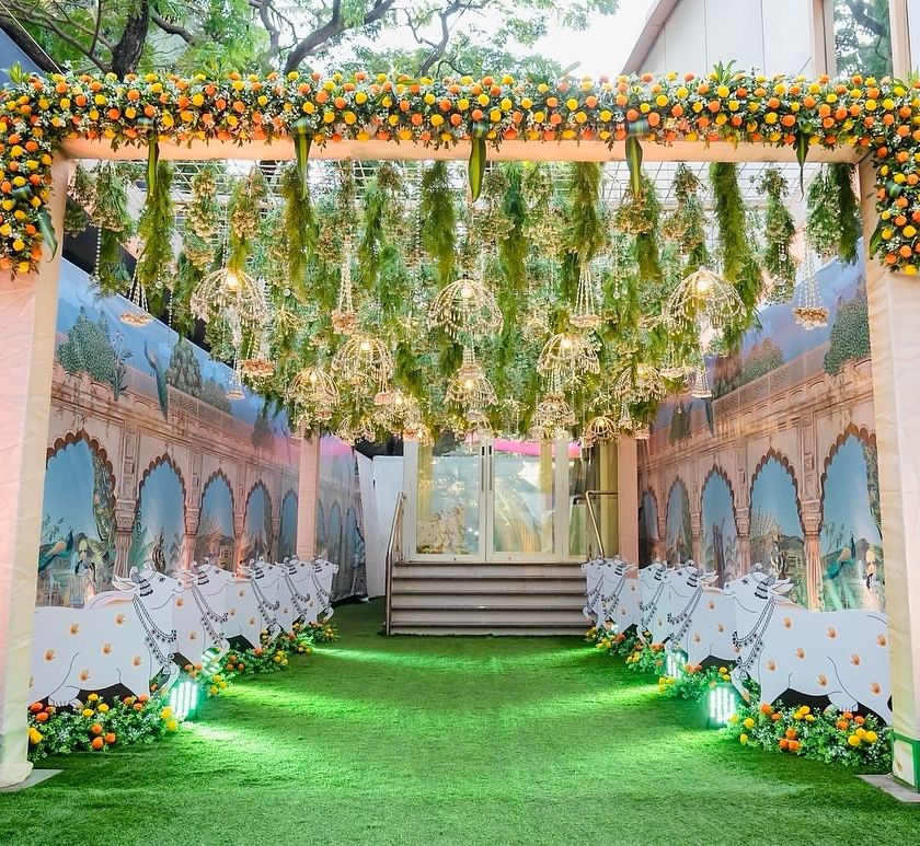 We specialize in creating immersive events using the timeless beauty of Pichwai art and Vrindavan themes. These setups are perfect for religious ceremonies, baby showers, and Garba nights, featuring elements like Radha-Krishna backdrops, sacred cow motifs, and vibrant, story-telling visuals.