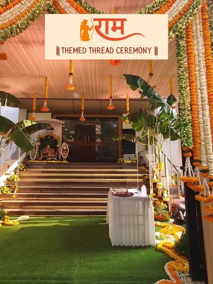 We offer diverse decor options for the sacred Janoi, or thread ceremony. We can create a classic, devotional atmosphere with a Ram-themed setup rich in marigolds, or a modern, serene ambiance using a soft pink and white floral palette.