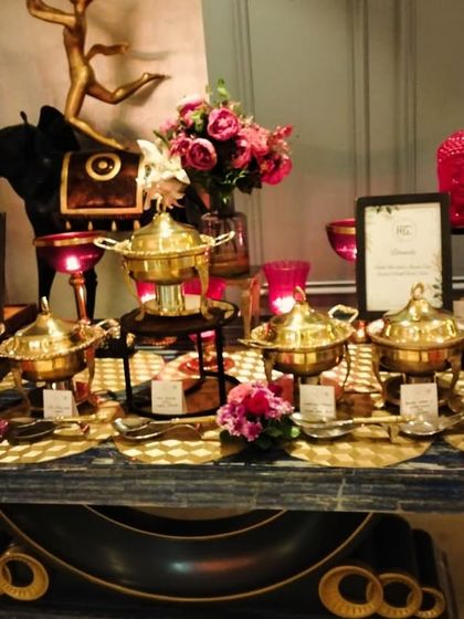 - Display: Food served in hammered copper/brass chafing dishes.