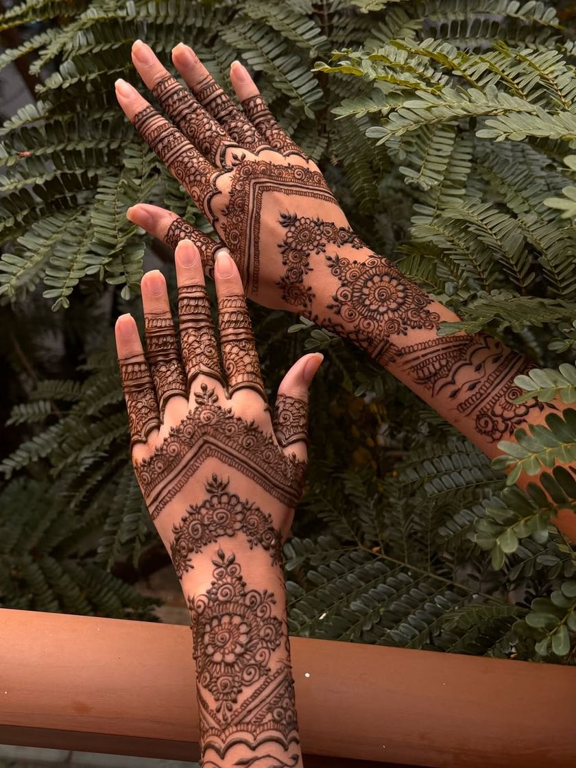 For a contemporary feel, I create designs that feature bold Arabic-style vines and geometric patterns. These styles use negative space to make the artwork pop, offering a lighter yet equally stunning alternative to traditional heavy mehendi.
