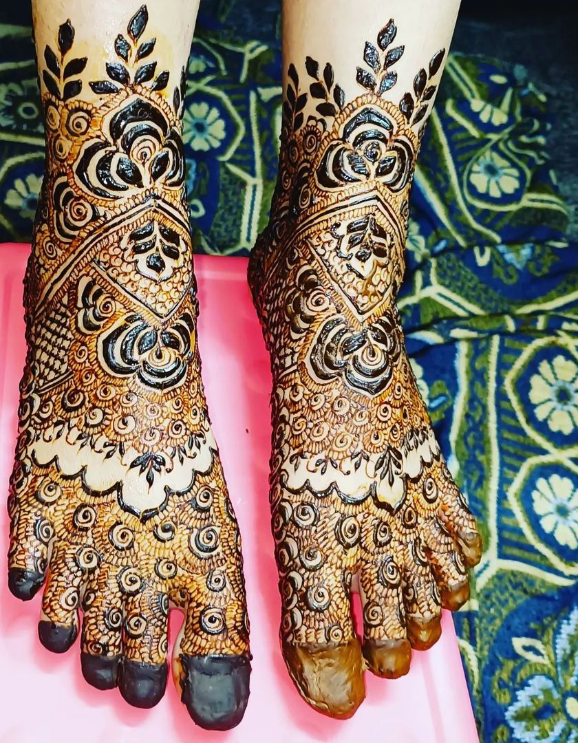 My work is all about the fine details, from delicate floral motifs and peacocks to precise checkerboard fills and shading. I use my own 100% natural henna paste, which allows for sharp lines and a beautiful, deep stain.
