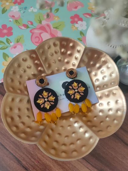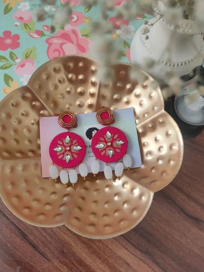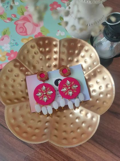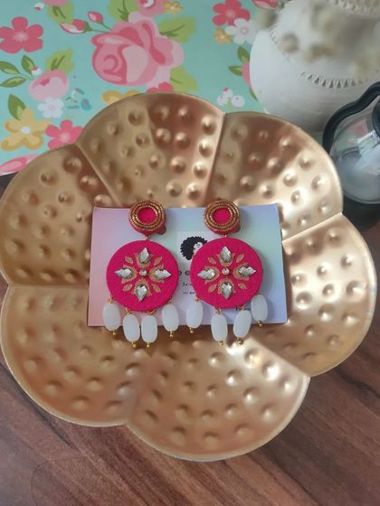 We craft unique earrings using traditional techniques like Zardozi and Gotapatti, along with contemporary fabric and bead designs. Each piece is handmade with careful attention to detail, incorporating mirrors, traditional Indian motifs, and intricate embroidery work.