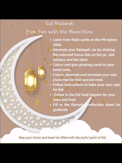 I design these kits to help families connect with the spirit of Eid and Ramadan. They include a mix of creative crafts like Sadaqah jar decoration and mosque painting, along with learning sheets about the festival's traditions and even a DIY cake mix for a sweet celebration.
