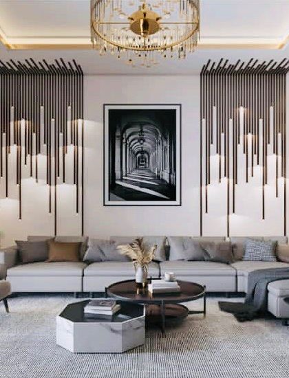 - Living rooms with marble or wooden accents, LED lighting, bold chandeliers