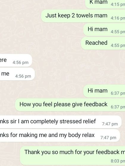 Hi mam, I’m a male massage therapist in Bangalore. For me, it’s simple - I want you to feel better, relaxed, and free from stress. Every session, I ask how you feel - that’s my success. Trust is everything, so I check in after massage. I want you to leave refreshed, not just okay. My goal? You feel stress gone, body light.