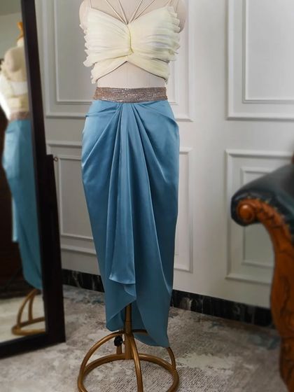 This is where I play with contemporary silhouettes that blend Indian and Western aesthetics. I create fresh looks like butterfly crop tops with draped skirts or fish-cut skirts with belted dupattas, offering a familiar feel with an innovative twist for the modern woman.