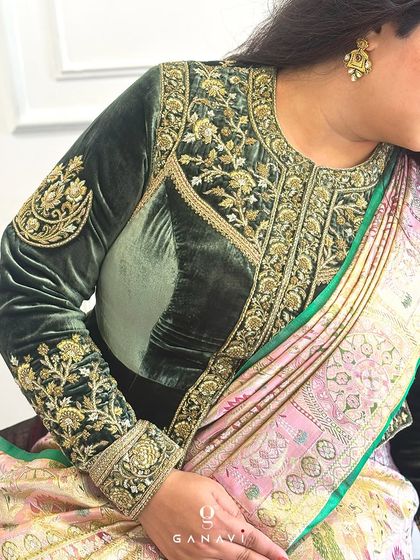 Blouses are my jam. Think of it as ‘architecture but with thread.’ I get into the details—zardozi, zari, beads, all on silk velvet or raw silk. Motifs can be temple designs, peacocks, vines—whatever means something to you. That hand-embroidered bridal blouse you’ve been dreaming about? I’m on it.