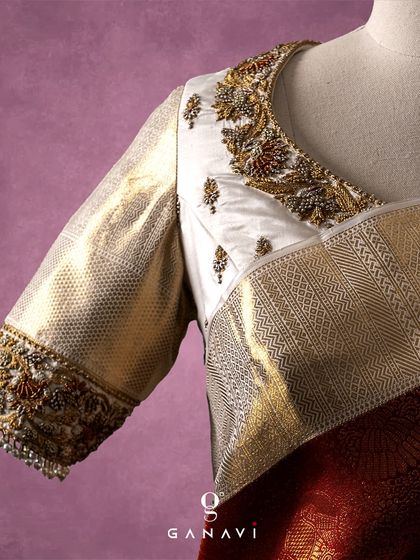 We make custom bridal and occasion outfits with hand embroidery, blending South Indian tradition and modern design, and can upcycle your old sarees into new pieces.
