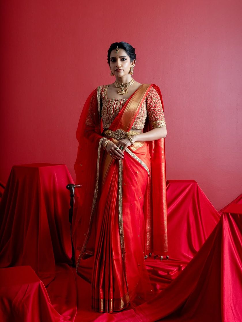 I hold a special place in my heart for the timeless elegance of the South Indian bride. I specialize in pairing exquisite Kanjeevaram and silk sarees with blouses that are masterpieces in their own right. This collection celebrates heritage weaves in classic reds and golds as well as contemporary pastels.