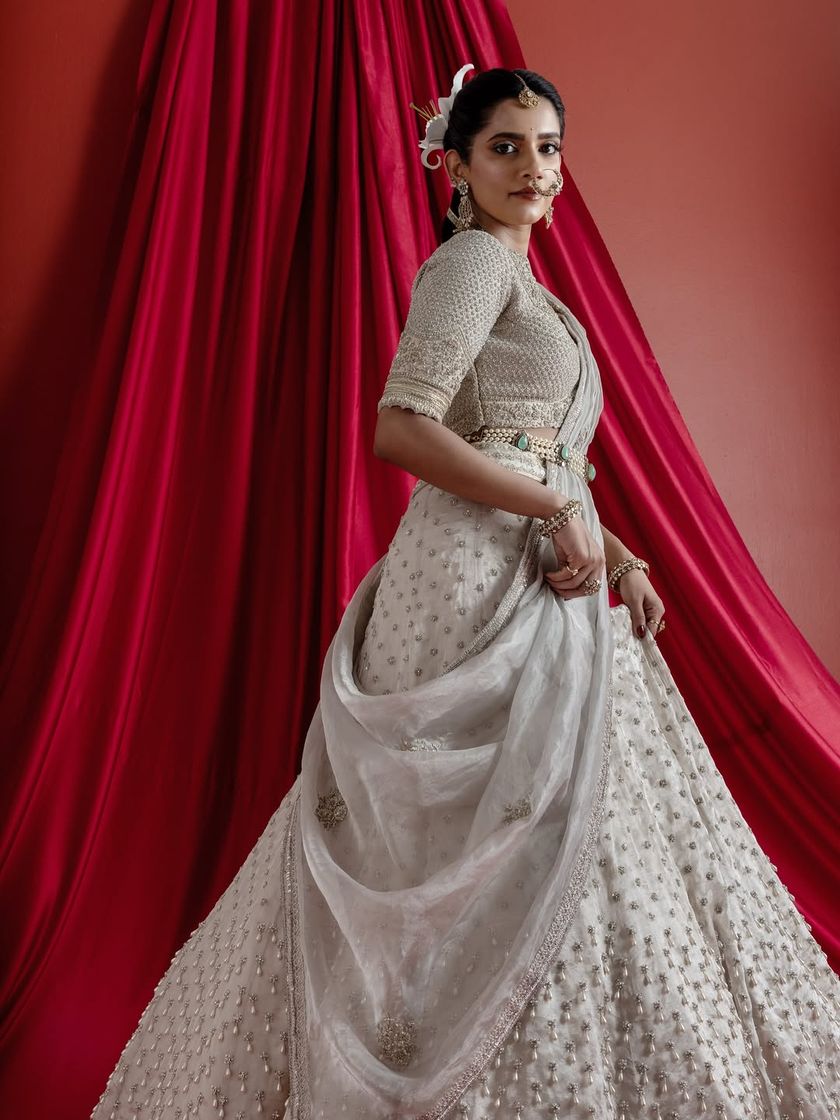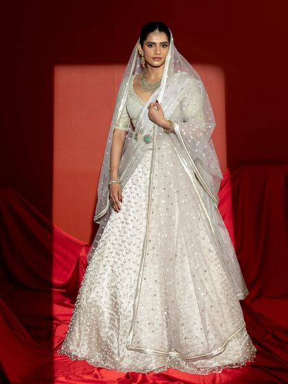 I create bridal lehengas that are a true reflection of you, blending timeless tradition with a contemporary spirit. Each piece is a canvas for intricate storytelling, from ethereal ivory lehengas with delicate pearl work to regal emerald green sets inspired by temple architecture and glamorous gold sequin ensembles for a modern reception.