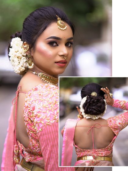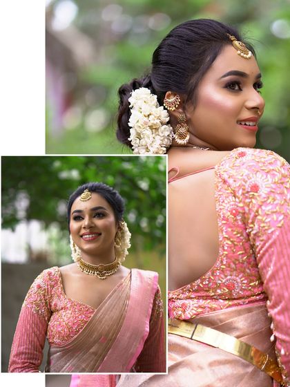 I do full South Indian bridal transformation myself, including HD makeup, hair styling, and saree draping, so you get a complete look that lasts all day.