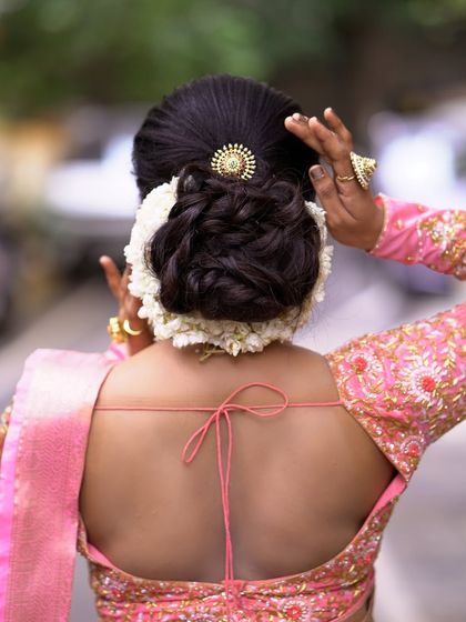 I style and treat hair for weddings and events, specializing in South Indian bridal braids with stitched flowers, custom extensions, and haircuts or treatments matched to your hair type and event needs.