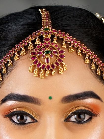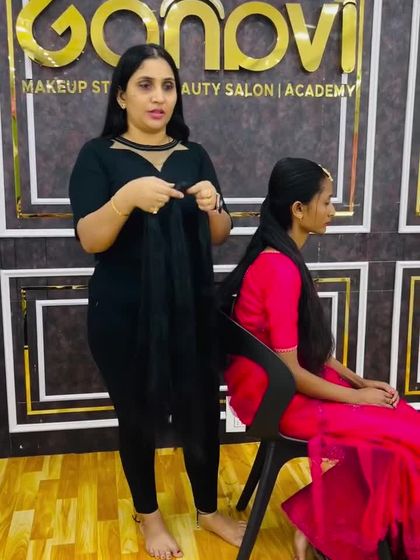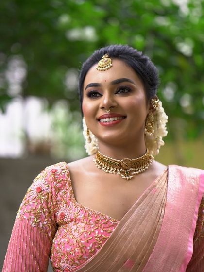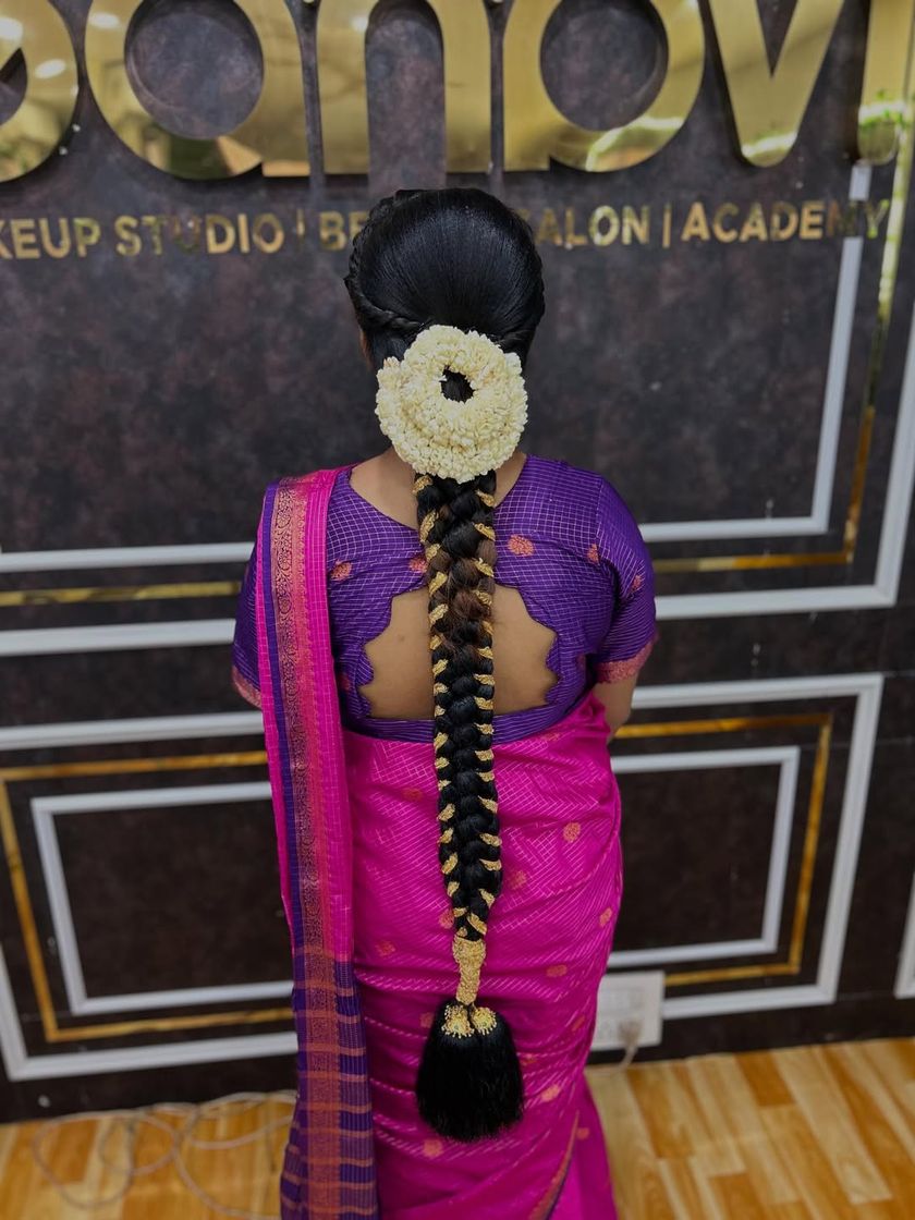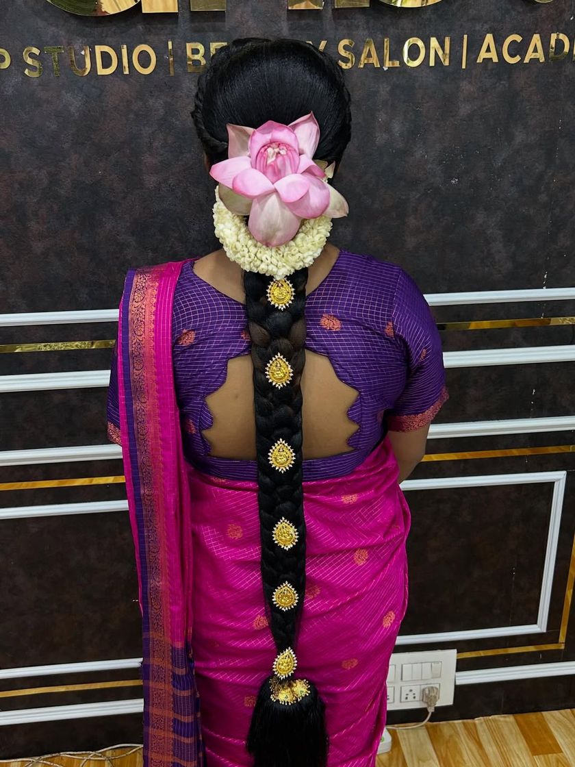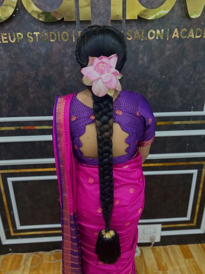 My specialty is creating long, intricate South Indian braids (Jadai). I use techniques like stitching fresh flowers and Jadai Billai directly onto the hair, and seamlessly blend extensions (Chouli/Savaram) for volume, ensuring your hairstyle is secure and comfortable throughout the ceremony.