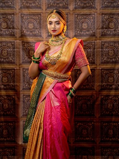 Most of my work is with brides. South Indian bridal saree draping, especially with those heavy Kanjivaram silk sarees, is my specialty. I know how to make your saree sit well with heavy jewellery, kamarbandh (waist belt), and all the hair and makeup fuss. Main thing is you should look regal and feel at ease.