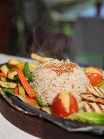 - Sizzler platters - BBQ Paneer loaded with rice, veggies, and fries, all served hot and sizzling.