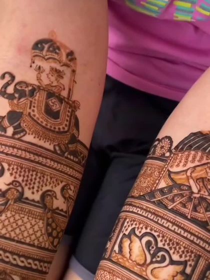 Your mehandi should tell your story. I specialize in creating custom portraits of the bride and groom, family members, and even pets, weaving them into designs that show your unique journey. From wedding scenes like the Varmala to religious figures like Radha-Krishna, I can draw anything you imagine.