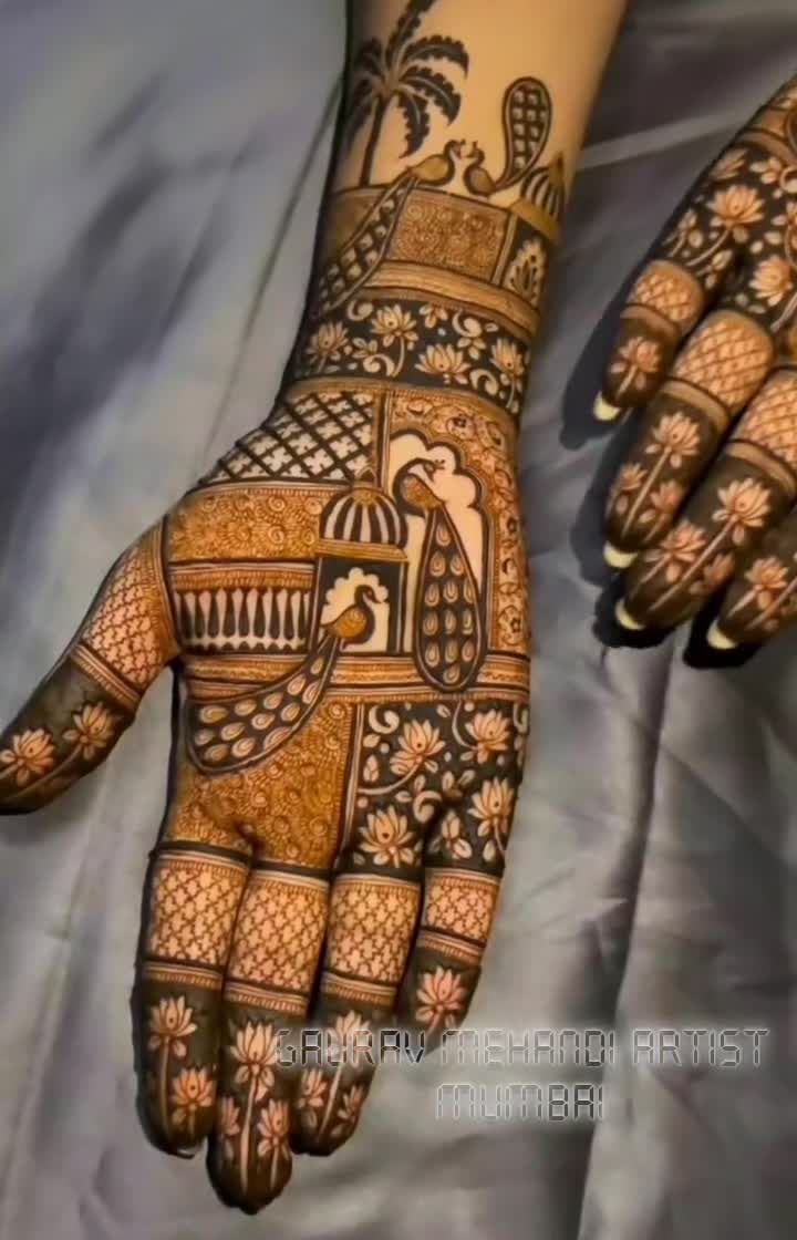 I love creating classic Rajasthani designs that are rich with tradition. This style features intricate patterns, fine lines, and iconic motifs like peacocks, elephants, paisleys, and grand palace jharokhas. These designs guarantee a deep, dark stain and a timeless bridal look.