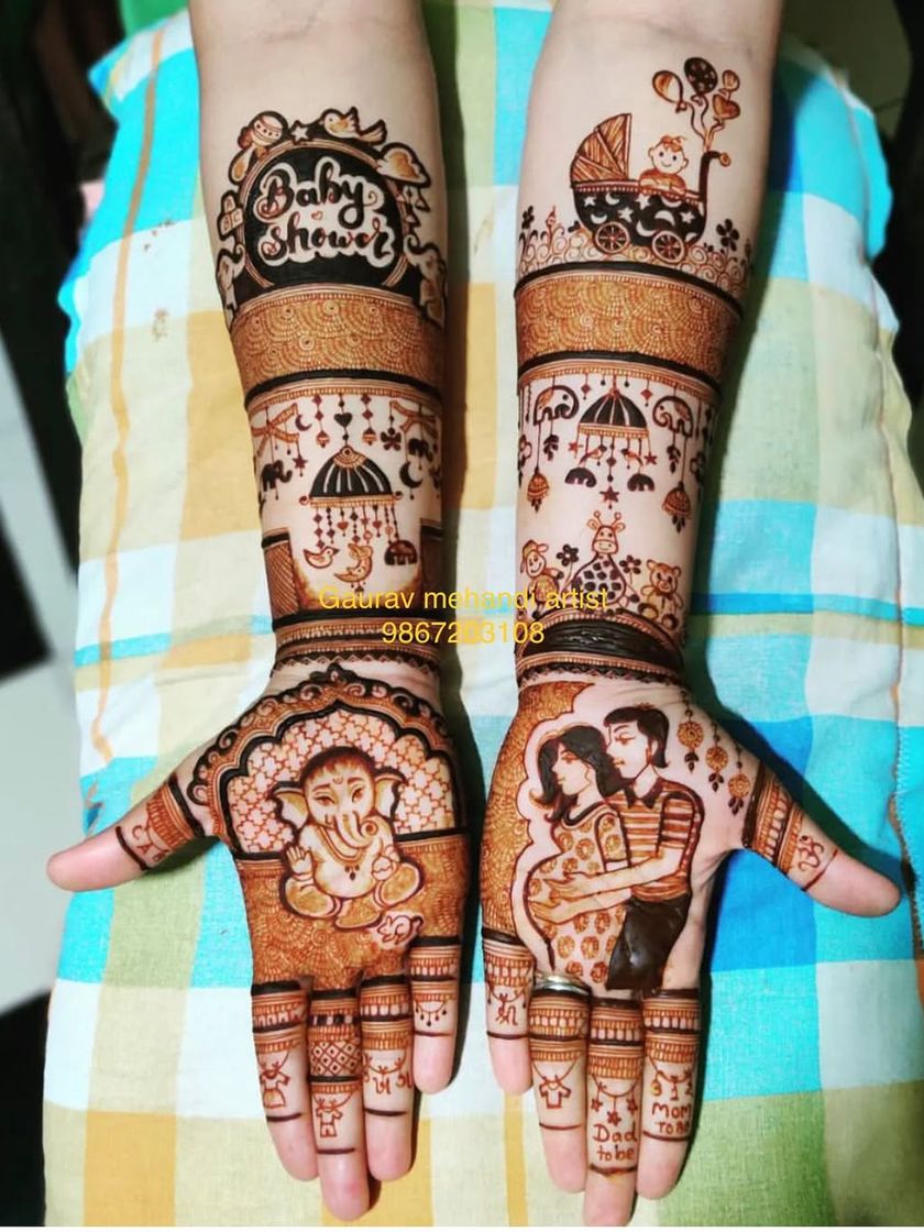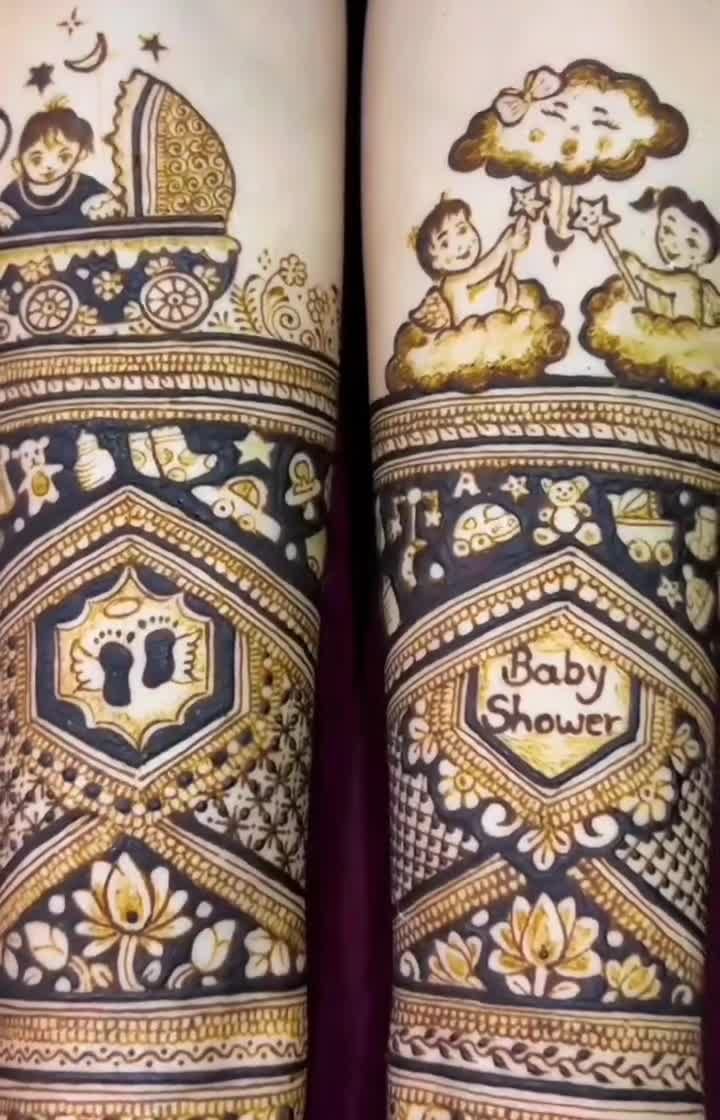 Celebrate the journey to motherhood with our special baby shower mehandi. We create adorable and meaningful designs featuring everything from "Mom to Be" text and baby footprints to cute cradles and family portraits.