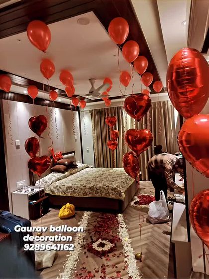 We specialize in creating intimate and romantic balloon setups perfect for first night celebrations. Our decorations typically include elegant combinations of red and white balloons, romantic messages, heart shapes, and soft lighting elements to set the perfect mood.