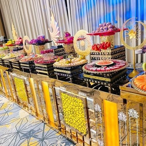 We believe presentation is key, and our food displays are designed to be a feast for the eyes. We offer a variety of counter styles, including modern backlit units, rustic wooden setups, and classic metallic arrangements, all customized to match your event's theme.