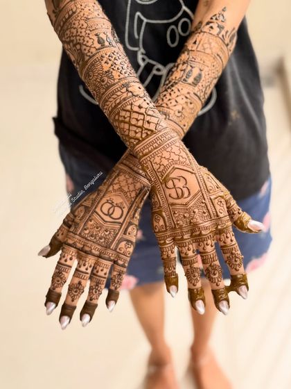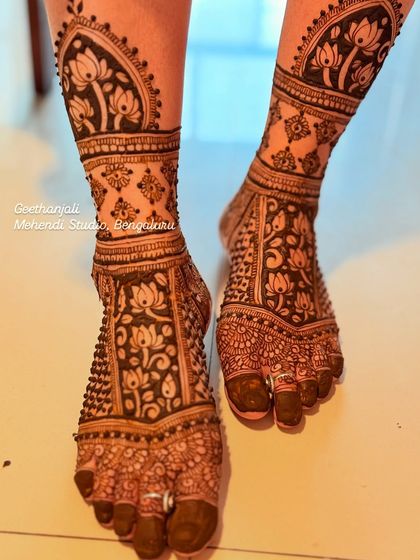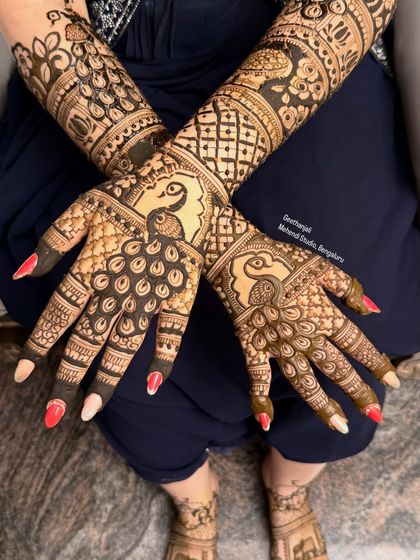 Namaskara ellarigu! I'm Geethanjali. Mehendi is my passion, not just work. The smell of fresh henna, the focus it needs, and the smiles from brides - that's my daily joy. Been lucky to take my art to Chicago too. Certified by ICNHA, I always keep my quality top. The best part? Old clients like Dr. Sindhura call me again for family events. NRI brides trust me just by word of mouth – avaru friends hatra maathadi nanna book madidru (she spoke to friends and booked me). I drive all over Bengaluru, ready for some mehendi magic.