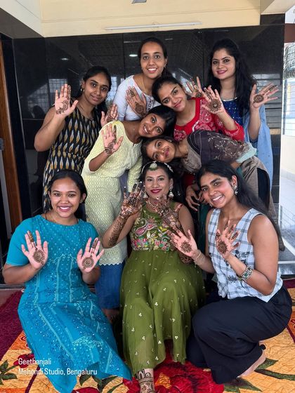 We do custom, organic mehendi for weddings and events, cover big guest lists with our team, and travel anywhere in Bangalore or for destination functions.