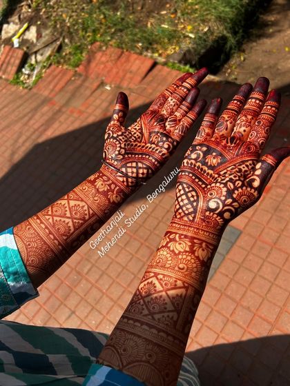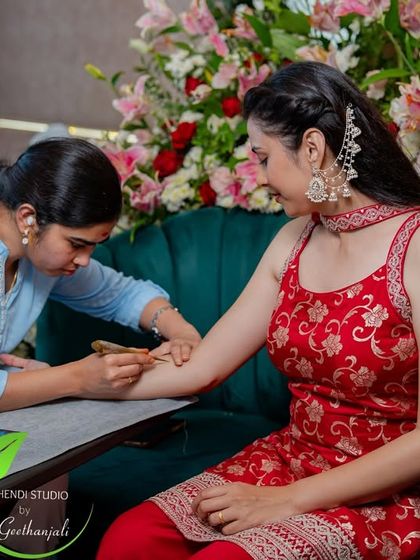 Namaskara ellarigu! I'm Geethanjali. Mehendi is my passion, not just work. The smell of fresh henna, the focus it needs, and the smiles from brides - that's my daily joy. Been lucky to take my art to Chicago too. Certified by ICNHA, I always keep my quality top. The best part? Old clients like Dr. Sindhura call me again for family events. NRI brides trust me just by word of mouth – avaru friends hatra maathadi nanna book madidru (she spoke to friends and booked me). I drive all over Bengaluru, ready for some mehendi magic.