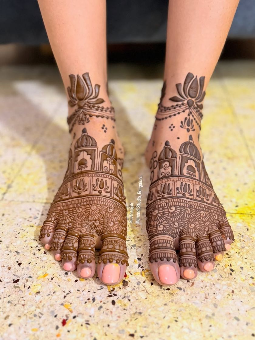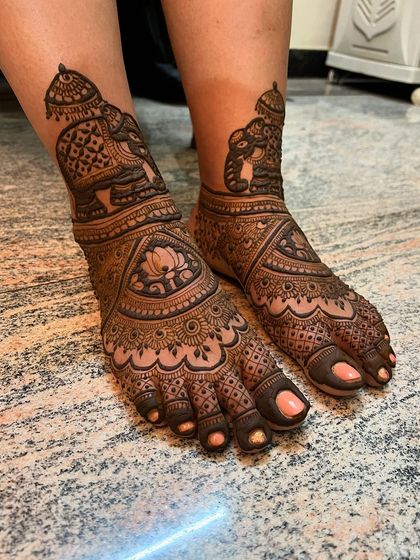 Bridal and party looks are incomplete without mehendi on the feet. I teach various styles, from simple and elegant ankle designs to full coverage that extends up the leg, using motifs that often complement the hand designs.