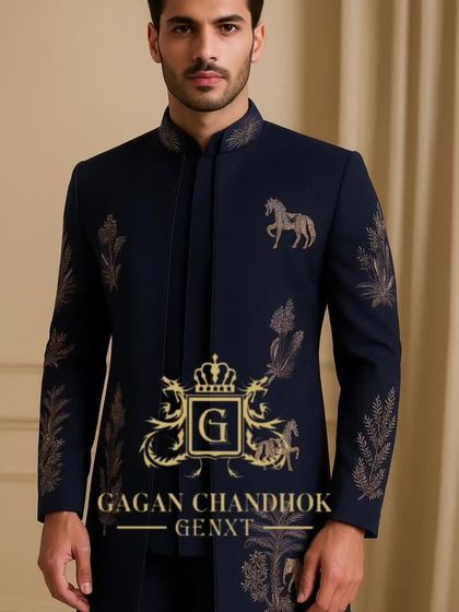 For the main event, I create outfits that command respect. My designer sherwanis feature unforgettable handwork, from classic ivory tones to bold motifs, while my bandhgalas are for power dressing, always sharp and custom-fitted.