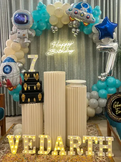 Three, two, one, blast off! I create out-of-this-world experiences with my space and galaxy-themed parties. These setups feature astronaut cutouts, rocket ship props, planet balloons, and starry backdrops to take your celebration to another dimension.