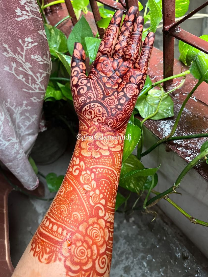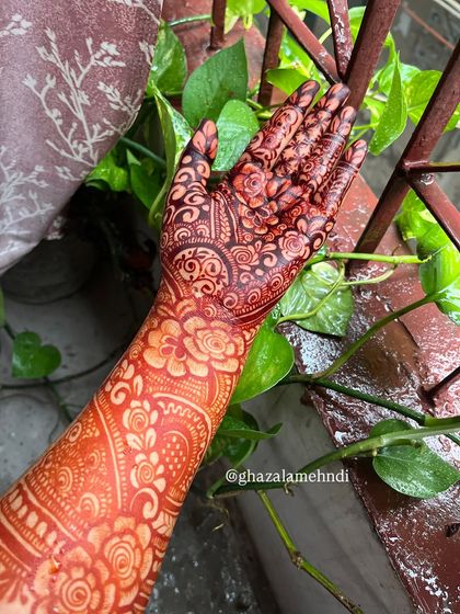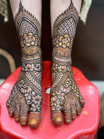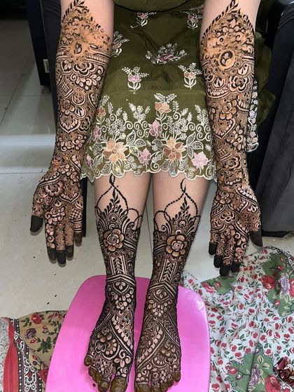 This is my specialty and my passion. I create detailed, full-coverage designs for a bride's hands, arms, and feet, ensuring every `dulhan` feels special on her big day. We can work together to create a unique design that tells your story, and I can even hide names or initials within the pattern.
