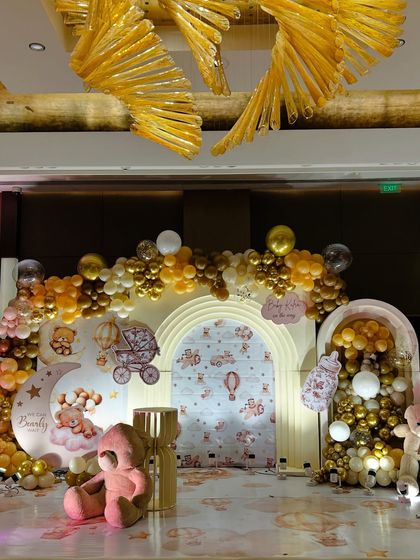 The teddy bear theme is a timeless classic that I offer in various styles to suit your taste. From modern boho designs with earthy tones and pampas grass to glamorous gold and white setups or dreamy blue and pastel palettes, we can create the perfect 'beary' special day.