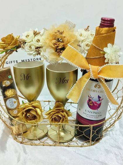 We specialize in creating memorable gifts for couples' special moments. Our signature items include customized ring platters for engagement ceremonies and luxury wedding hampers featuring wine, Mr. & Mrs. glasses, and chocolates.