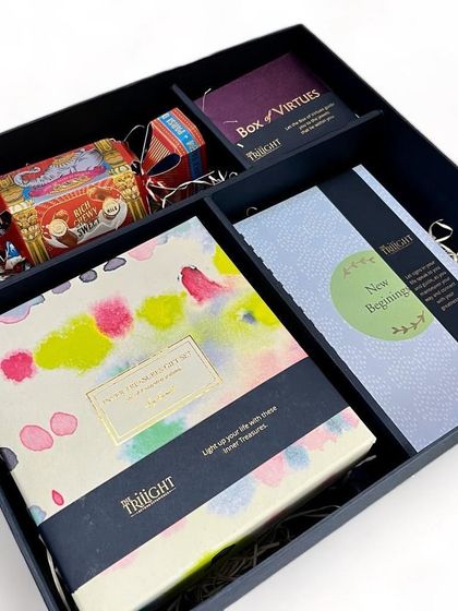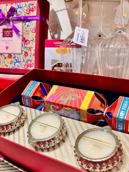 - Soy wax candles, festive diyas, our "Box of Virtues" (with natural stones), and select books