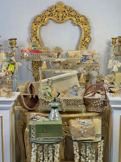 We design and package wedding and trousseau gifts with custom themes, names, traditional elements, and personal details for couples, families, and guests.