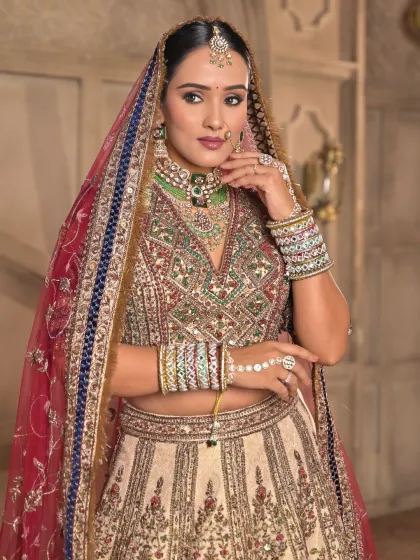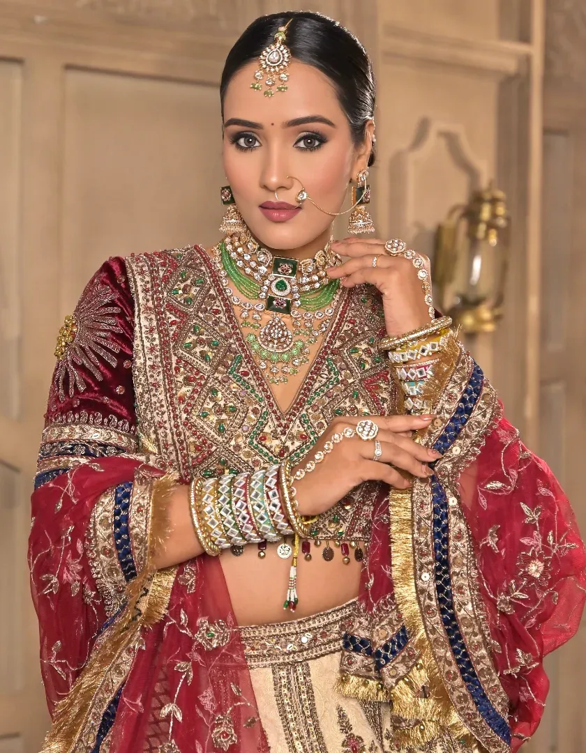 For the bride who dreams of a classic look, I create timeless and regal styles with red and maroon palettes. From rich velvet lehengas to intricate embroidery, the makeup is designed to complement the grandeur of the outfit, featuring sculpted features and majestic eyes.