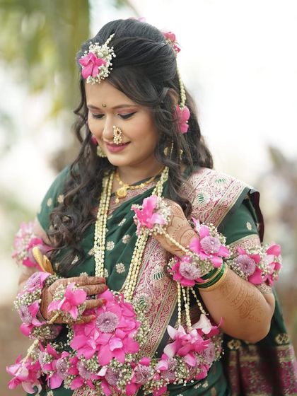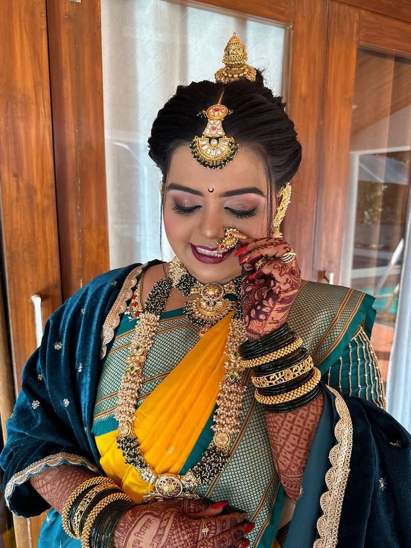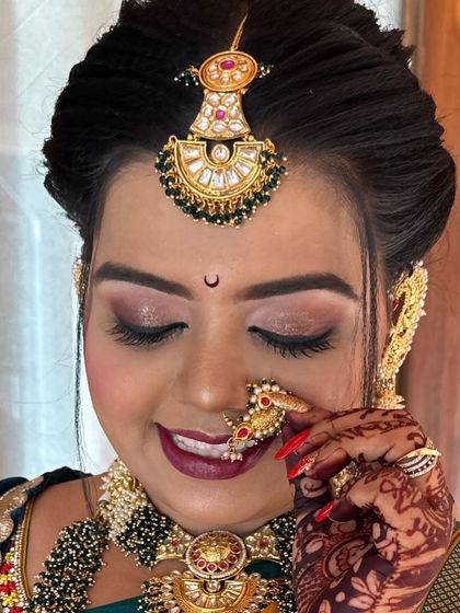 Creating the perfect Maharashtrian bridal look is my absolute passion. I focus on every detail that makes this look so special, from the perfect Nauvari saree drape and the traditional 'chandrakor' bindi to the intricate hairstyles ('khopa') adorned with fresh flowers ('phool') and authentic jewellery.