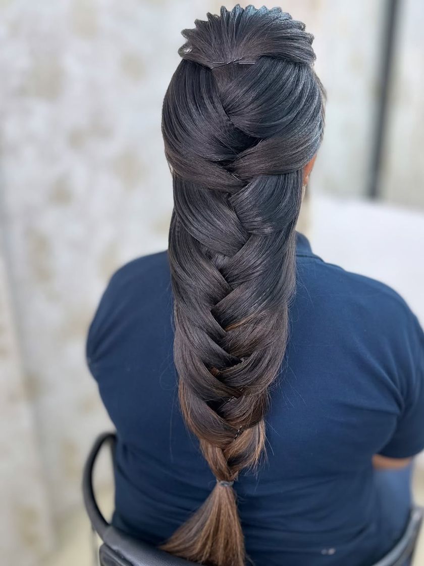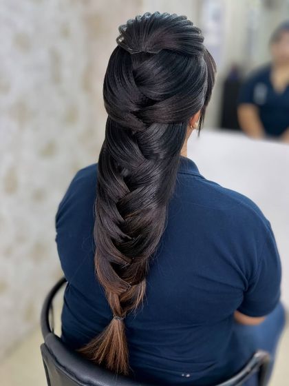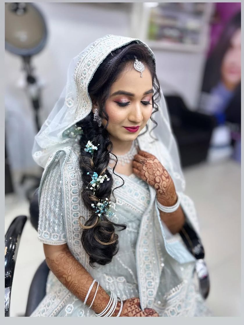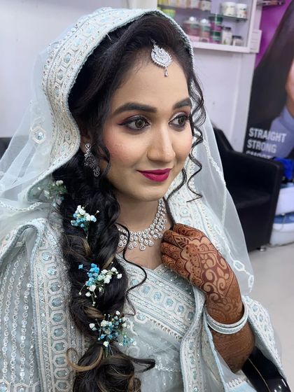 A great hairstyle completes any look. I create a wide variety of hairstyles, from traditional buns like the 'khopa' adorned with fresh 'gajra', to modern messy buns, intricate braids like the mermaid style, and soft, romantic open curls. I can also help you choose the perfect hair accessories to match your outfit.