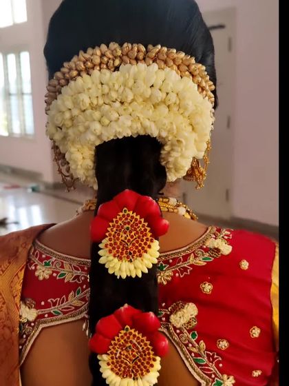Hair ties the whole look together. I do traditional styles like muhurtham jadai (bridal braid) with real flowers, especially jasmine if you want that classic touch. For receptions or sangeets: soft curls, waves, or simple updos. Whatever matches your outfit and mood.