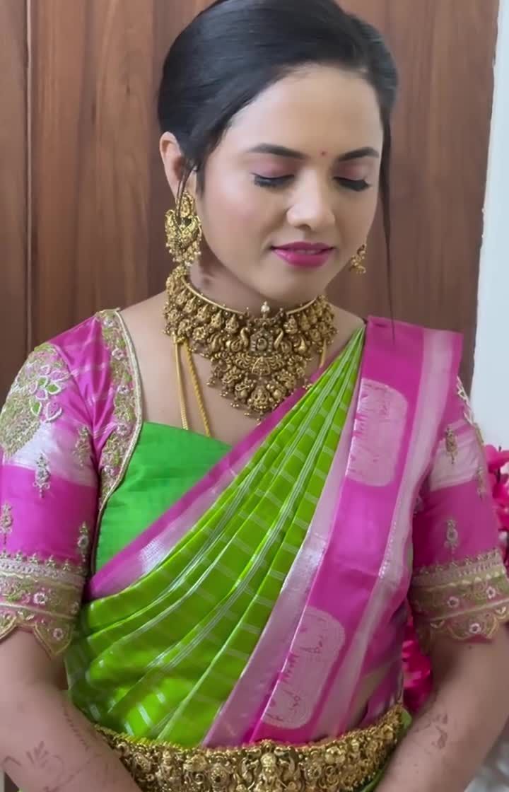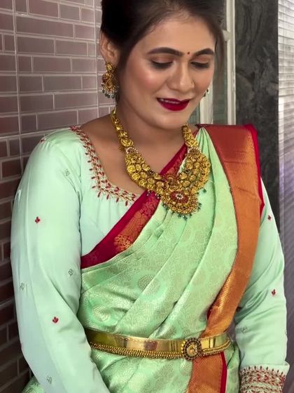 This is my specialty, the timeless South Indian bridal look. I focus on creating a flawless, sweat-proof base that lasts through the long ceremony, perfectly complementing your Kanchipuram saree and traditional temple jewellery.