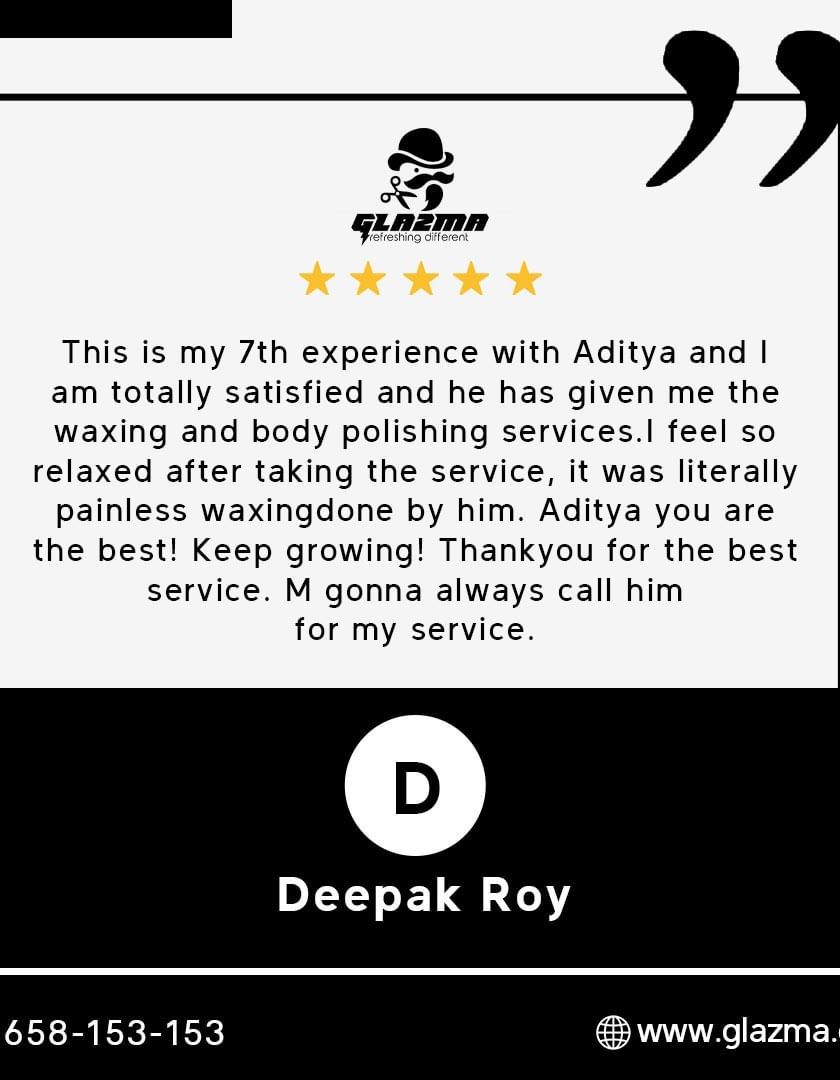 Beyond waxing, I offer a full range of men's grooming services right at your doorstep. This includes facials, de-tan treatments, body polishing, scrubs, and manicure-pedicures for a complete head-to-toe refresh.
